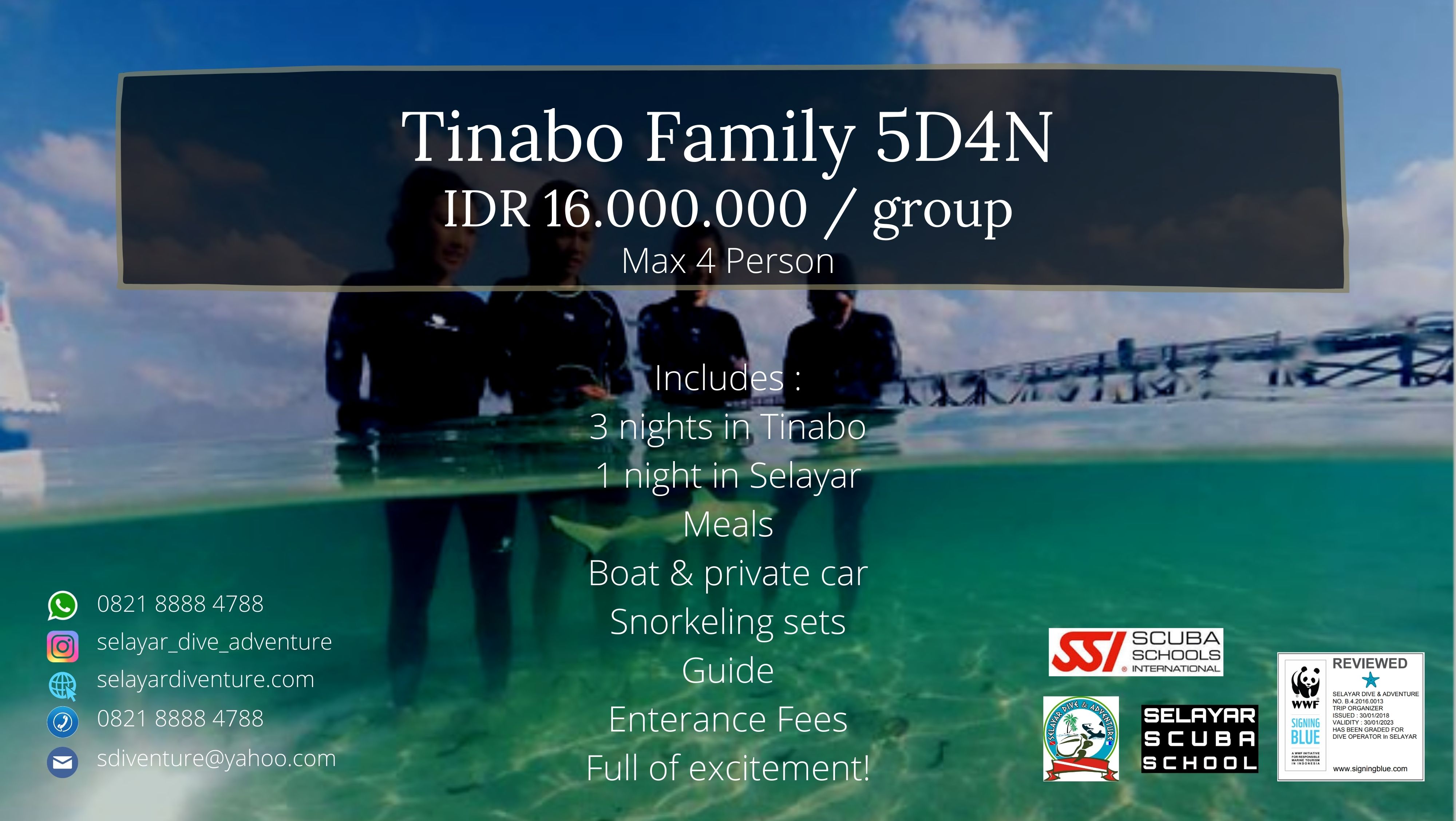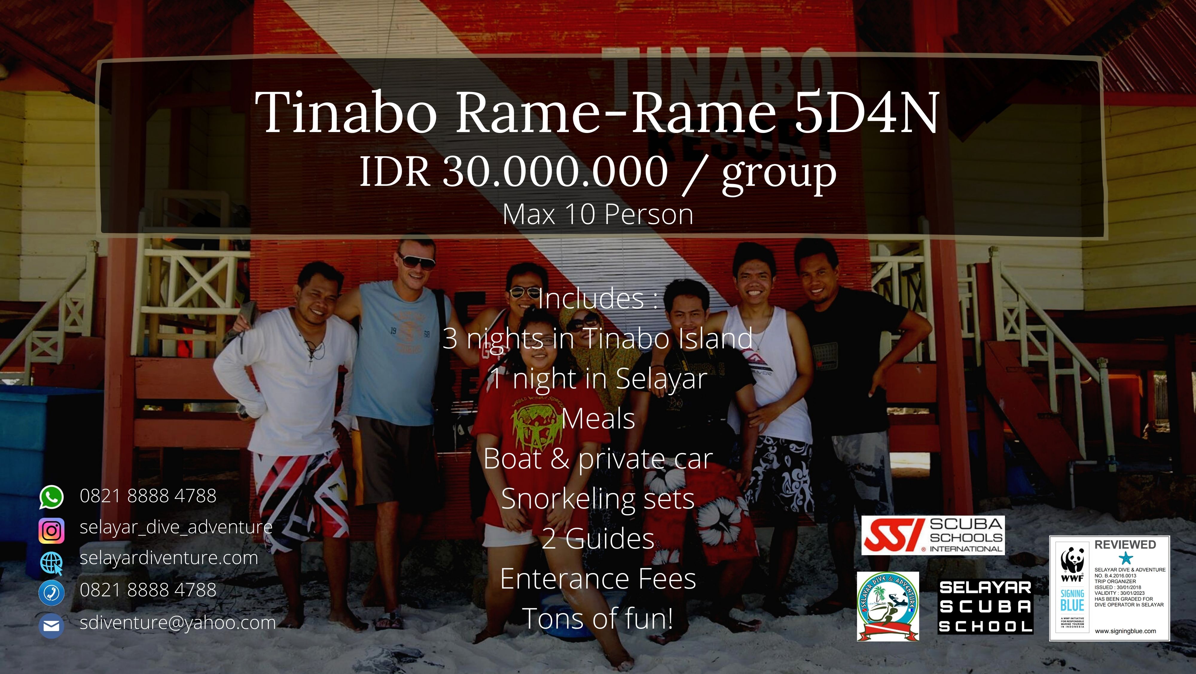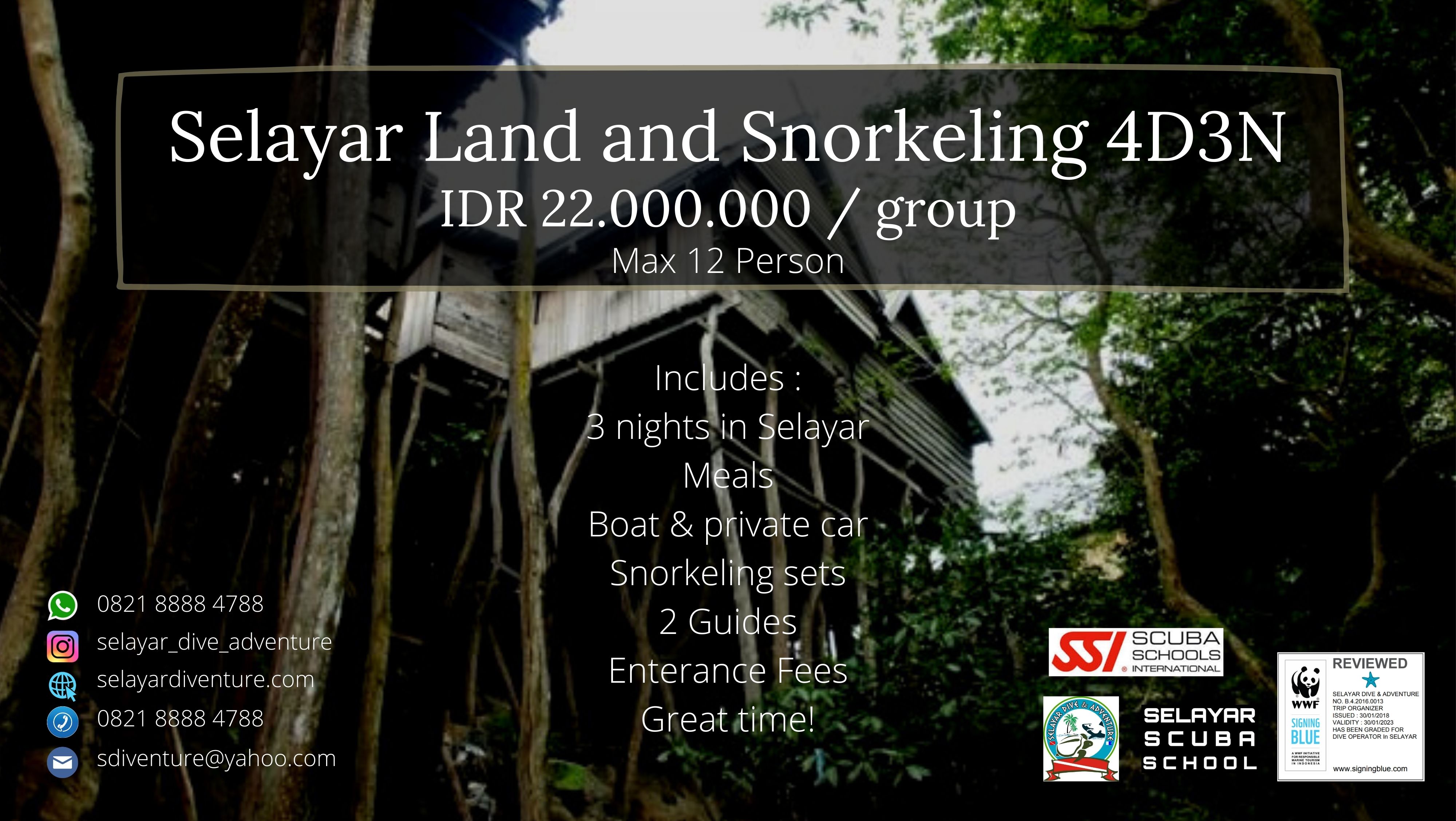 Kami telah berpengalaman saling berbagi kebahagian, bertukar tawa, canda dan cerita dengan para travelers di Kepulauan Selayar sejak 2010. Hubungi kami untuk informasi lebih lanjut. Jangan lupa follow instagram kami ya.