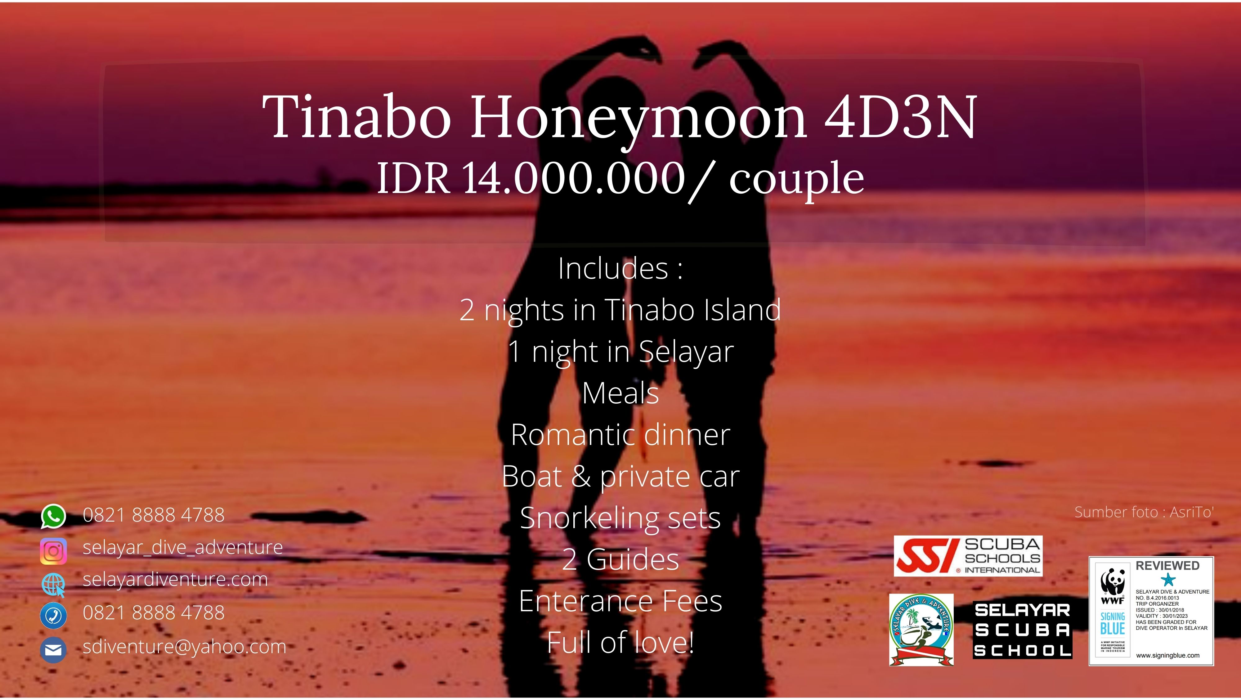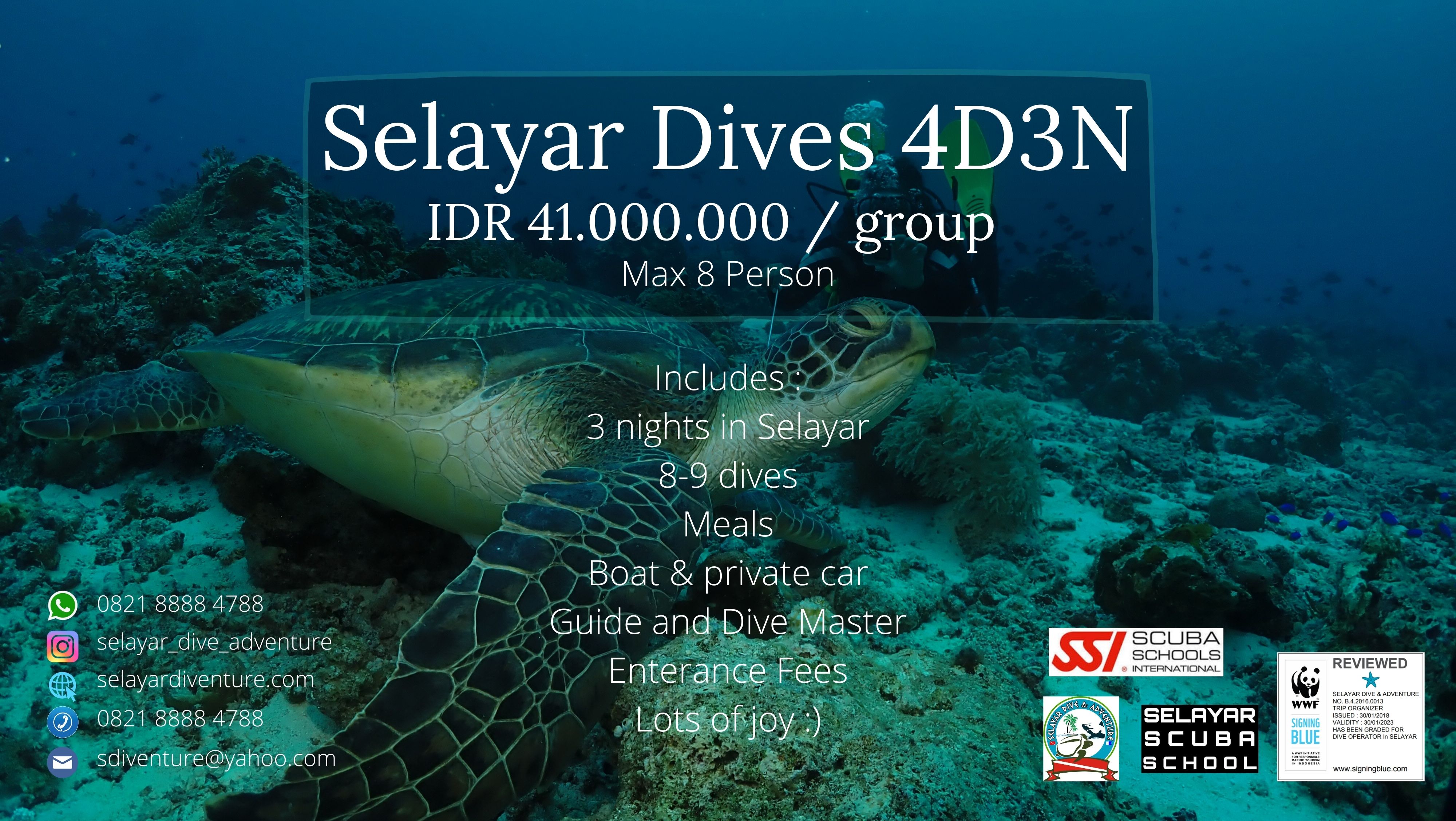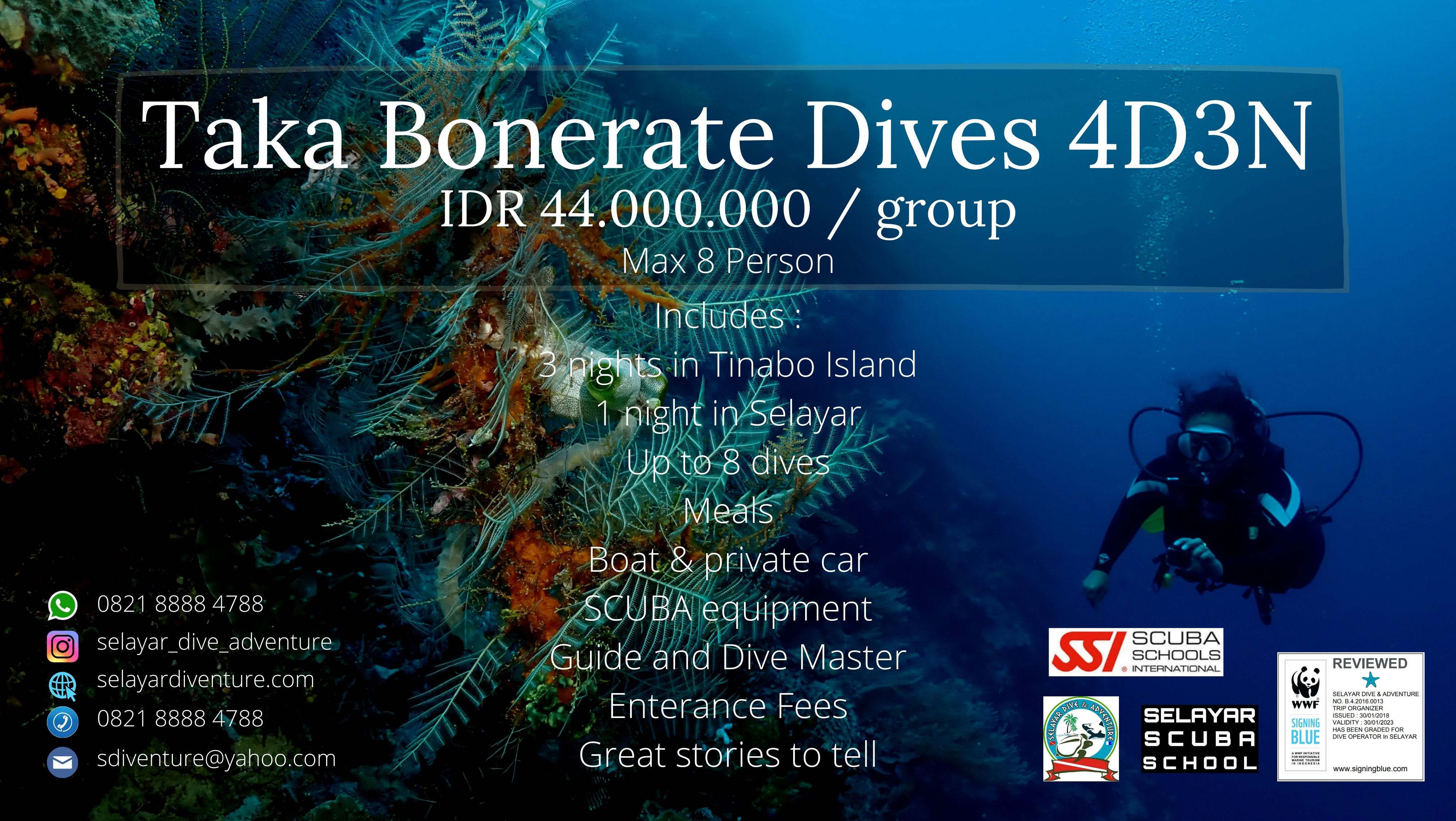 Kami telah berpengalaman saling berbagi kebahagian, bertukar tawa, canda dan cerita dengan para travelers di Kepulauan Selayar sejak 2010. Hubungi kami untuk informasi lebih lanjut. Jangan lupa follow instagram kami ya.